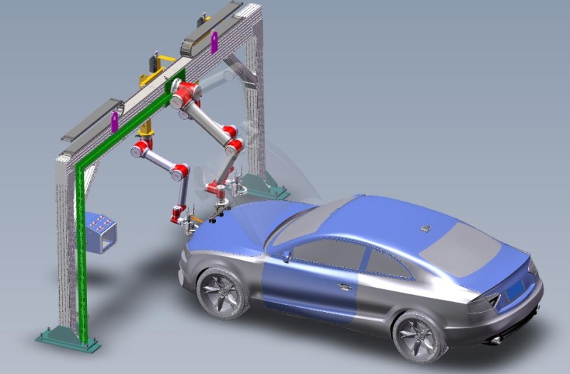 前照灯光轴自动调整设备包含以下内容: 机器人自动开启发动机舱盖: 3D视觉识别定位,吸盘吸附机构自动开启引擎盖,精准操作;