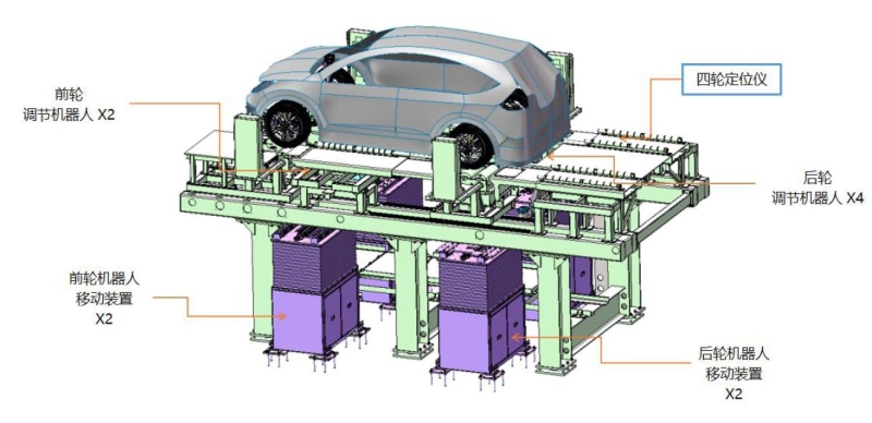 四轮定位前束自动调整设备是用于对车辆前轮和后轮前束自动调整的专用设备,通过机器人,携带四套自动扭力扳手完成自动调节、校准车轮定位测量要求,达到替代人工作业的调整的模式。